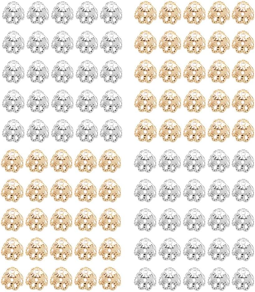 Product description Description:Material: alloy metalColor : Silver,Gold (each color 50 Pieces)Size: Approx 6x5 mmFiligree flower cup shape bead caps,Unique Millefior loose beads for jewelry makingYou can apply them on the earrings, bracelets, pendants, necklaces, DIY handmade craft.Package Includes:100 Pieces Bead CapsNote:Since the size above is measured by hand, the size of the actual item you received could be slightly different from the size above. Meanwhile, please be reminded that due to lighting effects, monitors brightness / contrast settings etc, there could be some slight differences in the color of the pictures and the actual item Manufacturer Contact Information NALINI SHUBHRA E-SHOP, Customer Care: nalanishubra5th@gmail.com, 9355855325