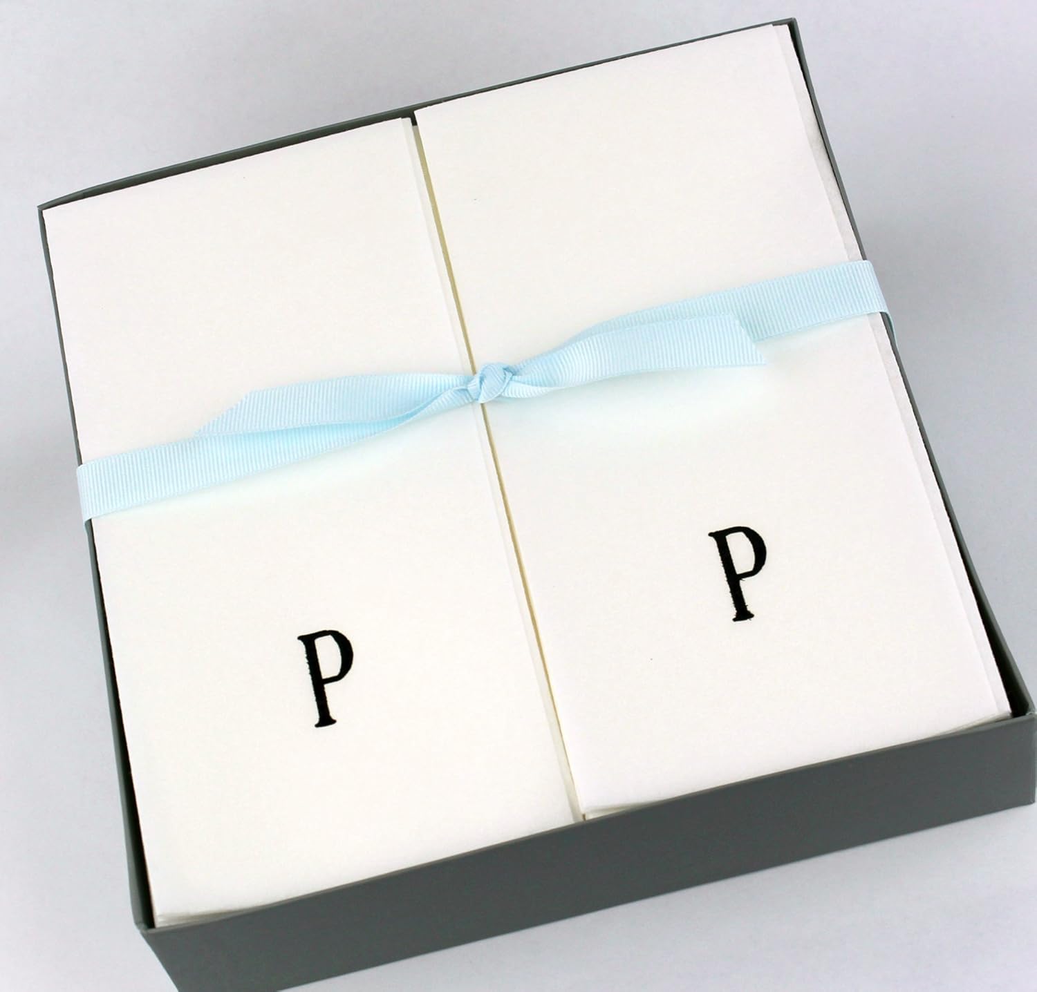 36 (1 36ct package) Nature's Linen (paper) Disposable Guest Hand Towels in a gift box with a ribbon, This 36ct. box of paper quest hand towels are personalized with a single block initial in black foil. Our Guest hand towels are great for adding that personal touch to your guest bath. Indulge your guests with this personal touch of luxury. They also make great gifts for a variety of occasions and events like: bridesmaid's gifts and favors, wedding favors, engagement party gifts, gifts or the mothers of the bride and groom, bridal shower gifts, baby shower gifts, anniversary gifts, birthdays, graduations, congratulations, thank you gifts, mother’s and father’s day gifts, and of course any holiday celebration like Christmas, Thanksgiving, Easter, and more. Their uses are limited only by your imagination!