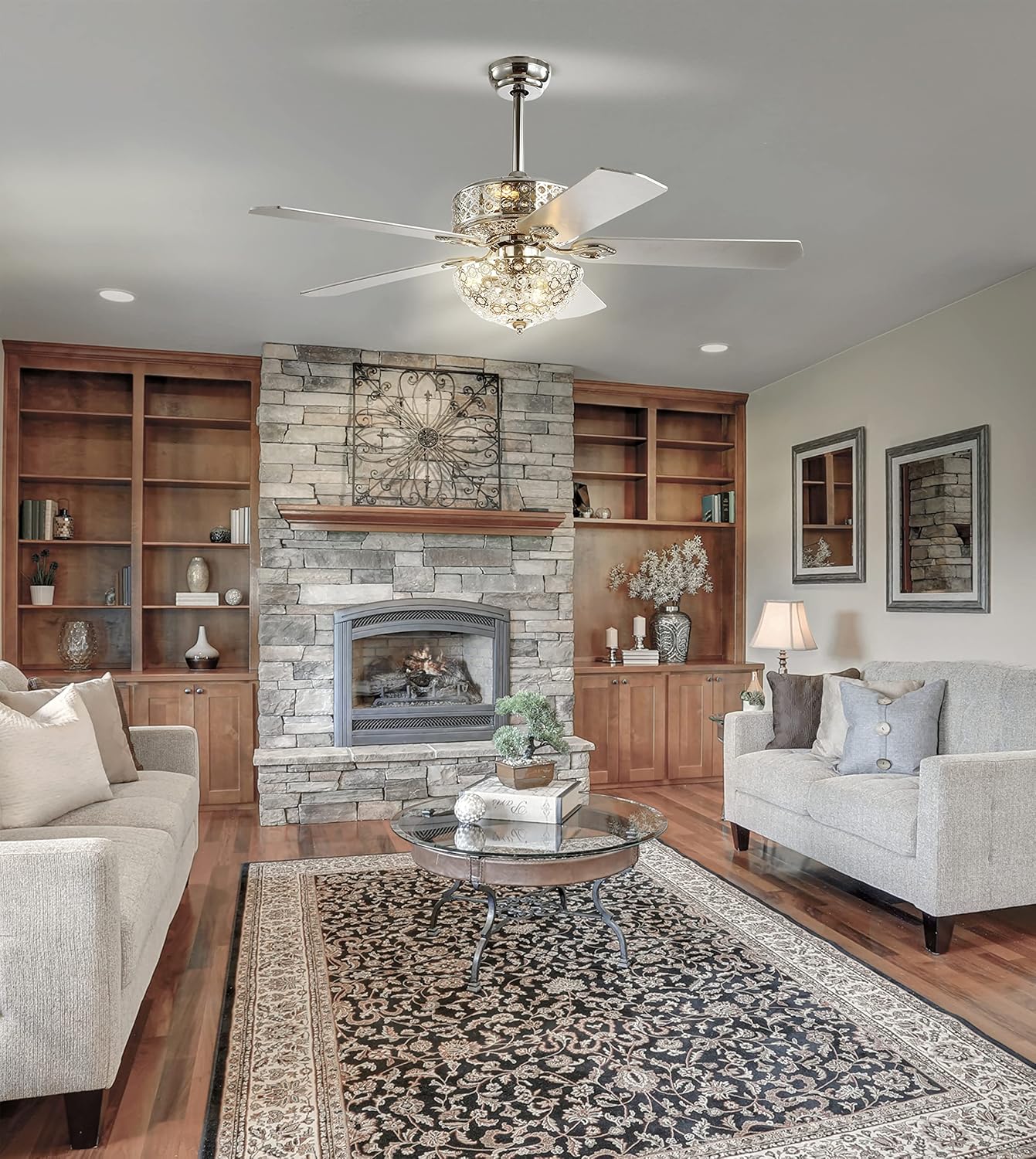 This glamorous 52" filigree ceiling fan will add some sparkle to your ceiling. A chrome finish is complemented by five reversible blades in silver maple or white. The stylish filigreed dome light has six bright LED bulbs.