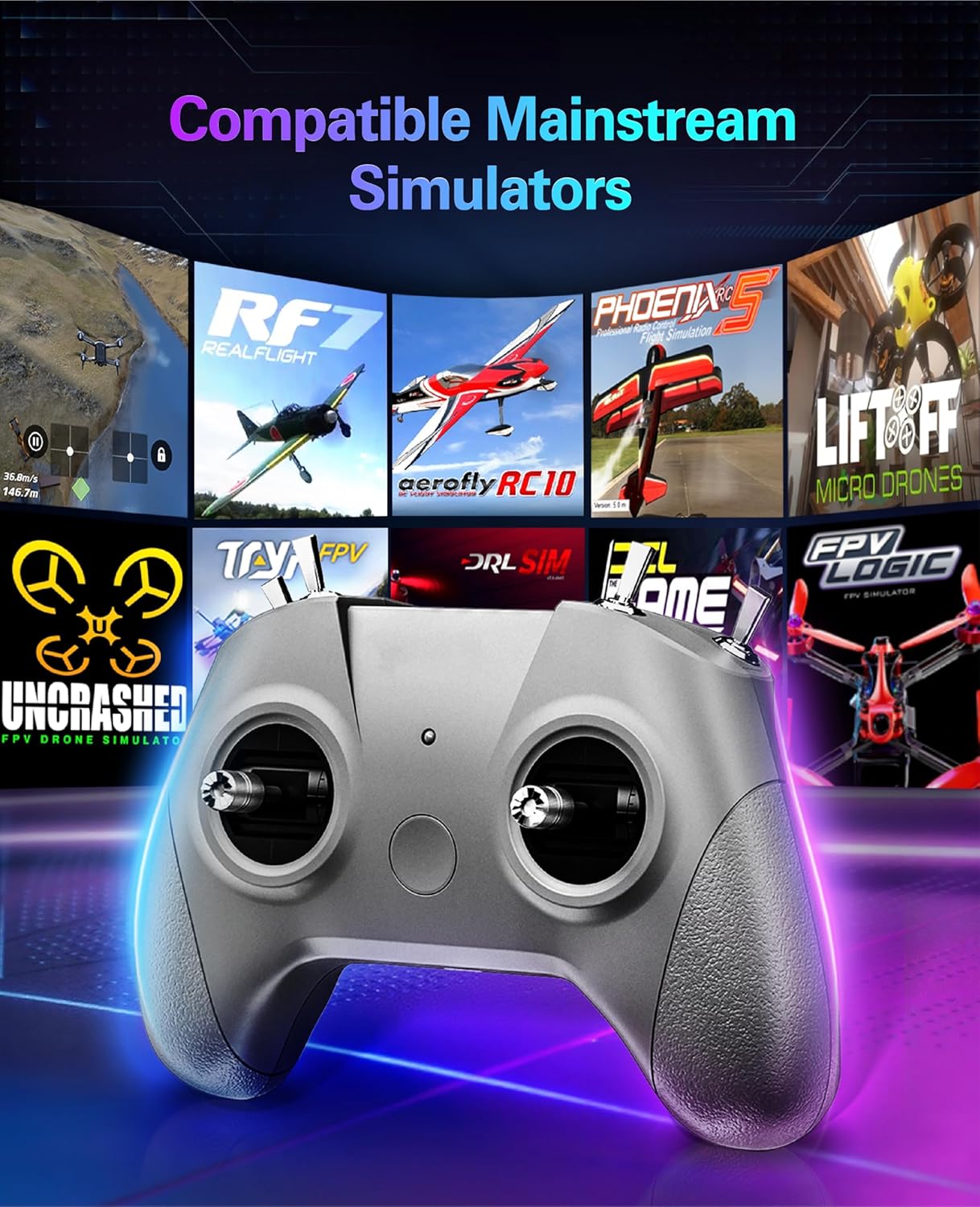 • 【4 Mode Simulator Access】The S8 Pro controller unlocks universal compatibility with nearly all major FPV and RC flight simulators across Windows, macOS, and Android, delivering a seamless cross-platform training experience for pilots of all skill levels.Yellow Light Mode Works with Liftoff, Uncrashed, DRL, VelociDrone, RealFlight Evolution and other Steam simulators. Also supports mobile apps including DJI Virtual Flight, FeelFPV, SimuFlight, and Freerider.Green Light Mode Optimized for DJI Virtual Flight.Purple Light Mode Compatible with Aerofly RC 10.Blue Light Mode Designed for Phoenix RC 6.0 / 5 / 5.5
